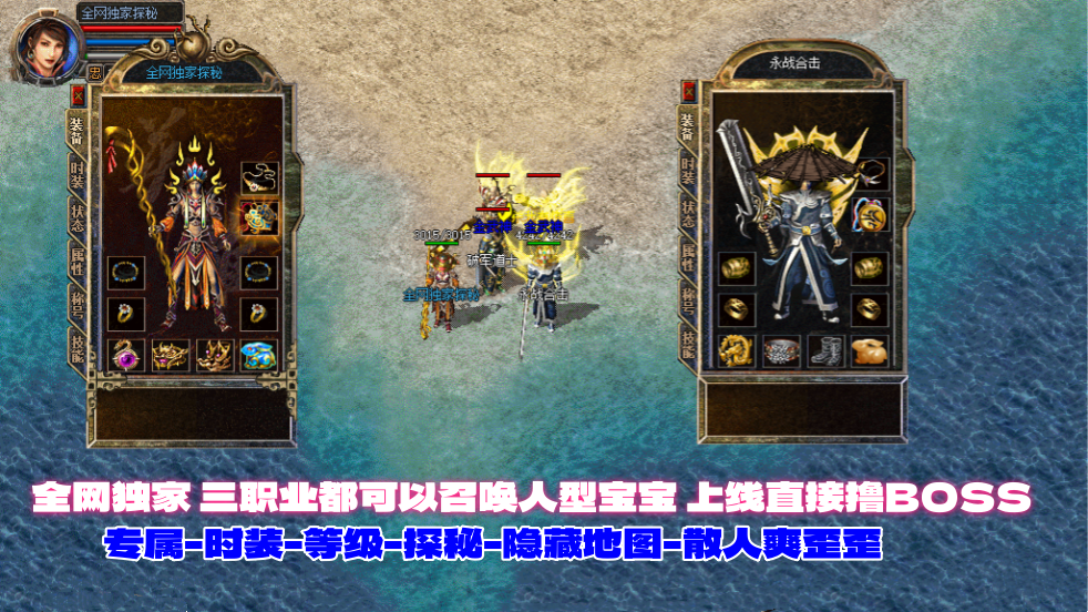 【特色介绍】:自动挂机,高级宝宝,自动回收,自动捡起,特殊神技,永战秘境,仅此一家。